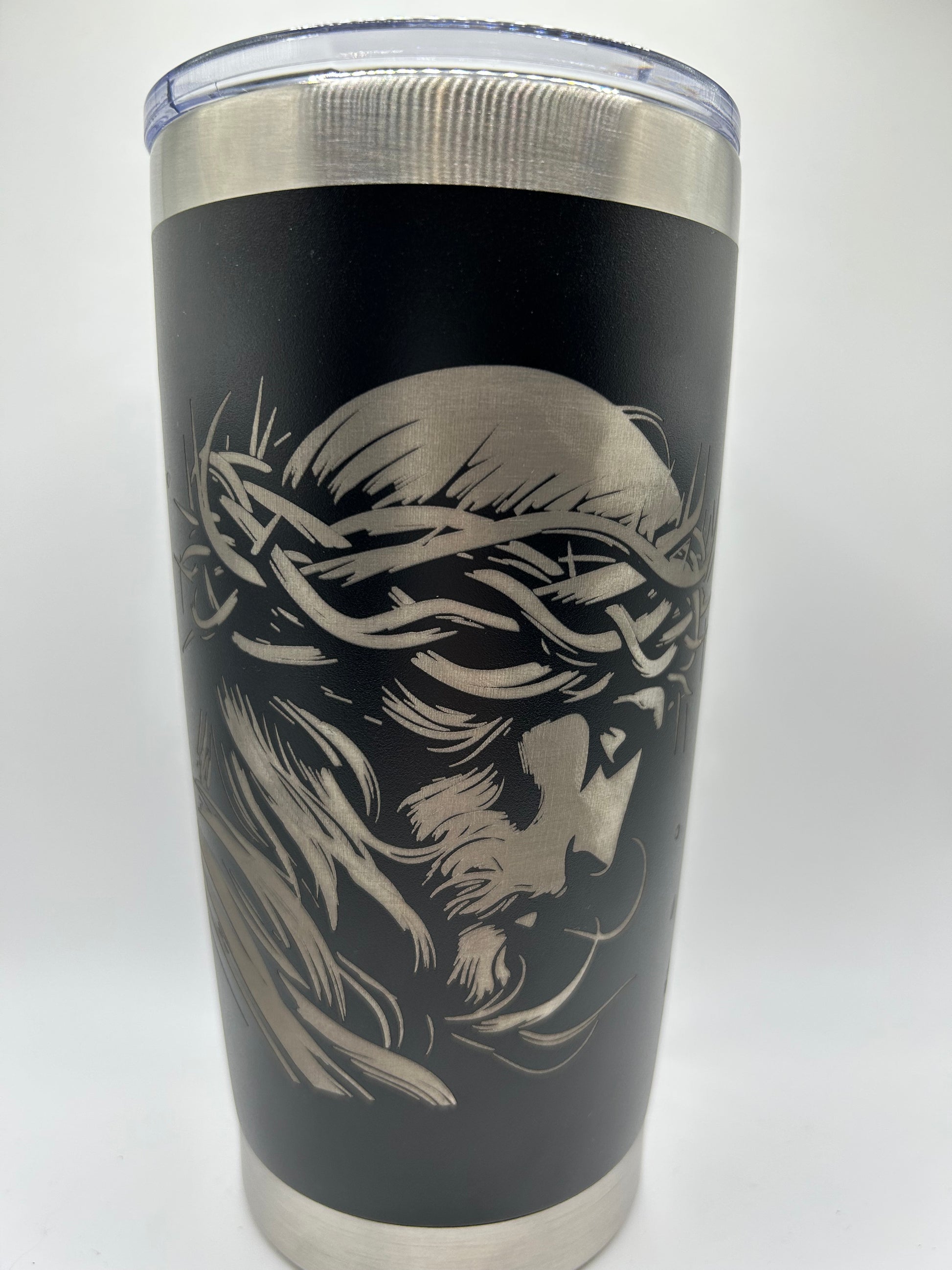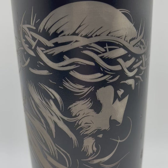 Carry your faith, your focus, and your favorite drink with you. This 30 oz stainless steel tumbler features a stunning, high-definition laser engraving of Christ wearing the Crown of Thorns—a beautiful and powerful image of unwavering sacrifice and grace.